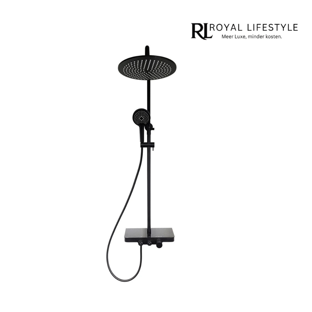 Geef je badkamer een stijlvolle upgrade met de LYSKA Wiesbaden Nuovo Opbouw Doucheset met Planchet in mat zwart. Deze moderne doucheset combineert strak design met praktische functionaliteit. De set bevat een elegante douchestang, handdouche, doucheslang en een handig planchet waarop je shampoo of zeep gemakkelijk kwijt kunt.